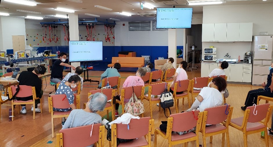 老化のメカニズムの説明から加齢に伴う運動・認知機能の低下を予防するための運動方法を、実技を交えて紹介しました。 腰痛体操や認知症予防体操の実演時は大変盛り上がり、好評をいただきました。 アンケート結果からも非常に満足度の高い結果となっており、地域の方々の健康に対する関心の高さが伺えました。 今後もデイサービスとともに地域での活動を継続して、地域の方々の健康や福祉に貢献していきたいと思います。